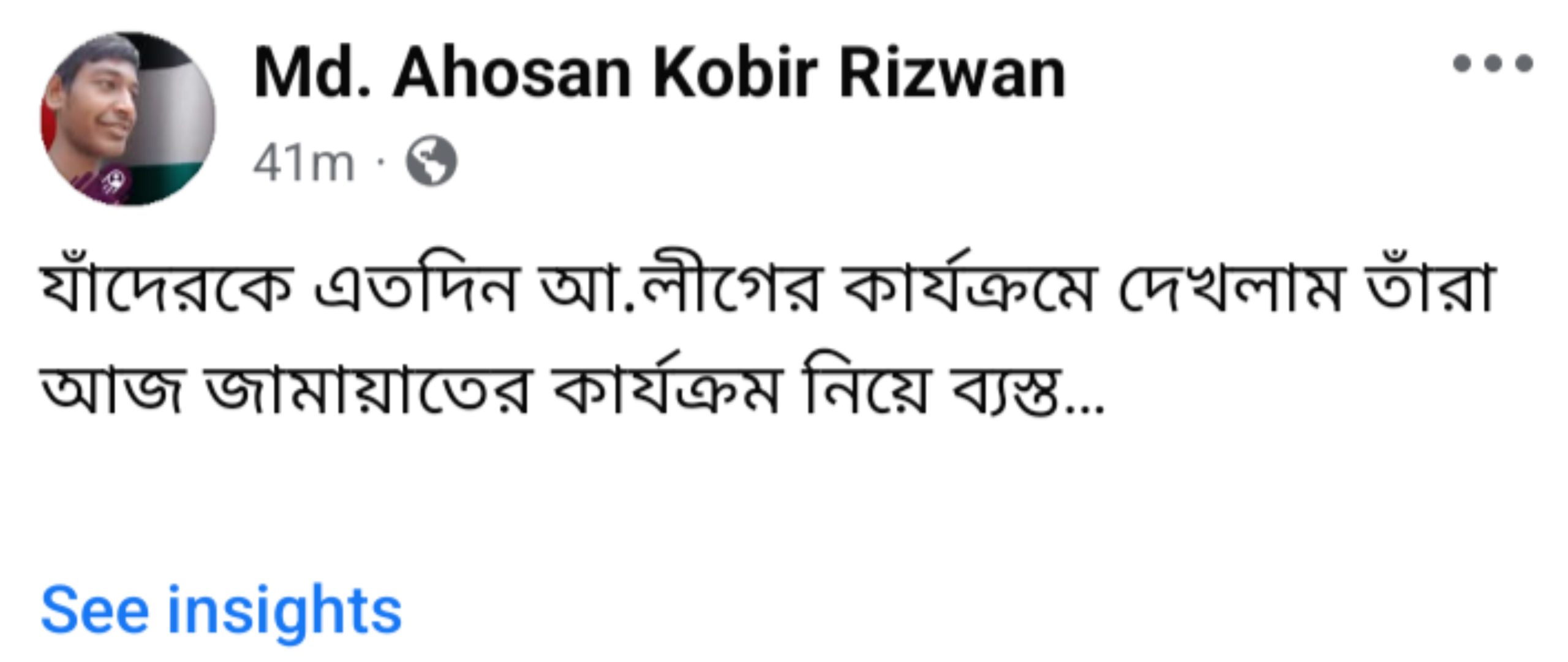 আমি দেখেছি, জামায়াত বা তাদের অঙ্গসংগঠনের কেউ আমাকে গুরুত্ব দেয়নি। এমন আচরণ করেছে যেন আমাকে চিনেই না। আরও অবাক হয়েছি দেখে যে, আগে যারা আওয়ামী লীগের ঘনিষ্ঠ ছিল, তারাই এখন জামায়াতের ঘনিষ্ঠ সেজে ঘুরছে। যদি জামায়াত সরকার গঠন করত, হয়তো তাদের কাছেই গুরুত্ব পেত সেই পুরোনো সুবিধাভোগীরাই। সাধারণ সমর্থক বা কর্মীরা ততটা মূল্য পেত কি না, সে প্রশ্ন থেকেই যায়।